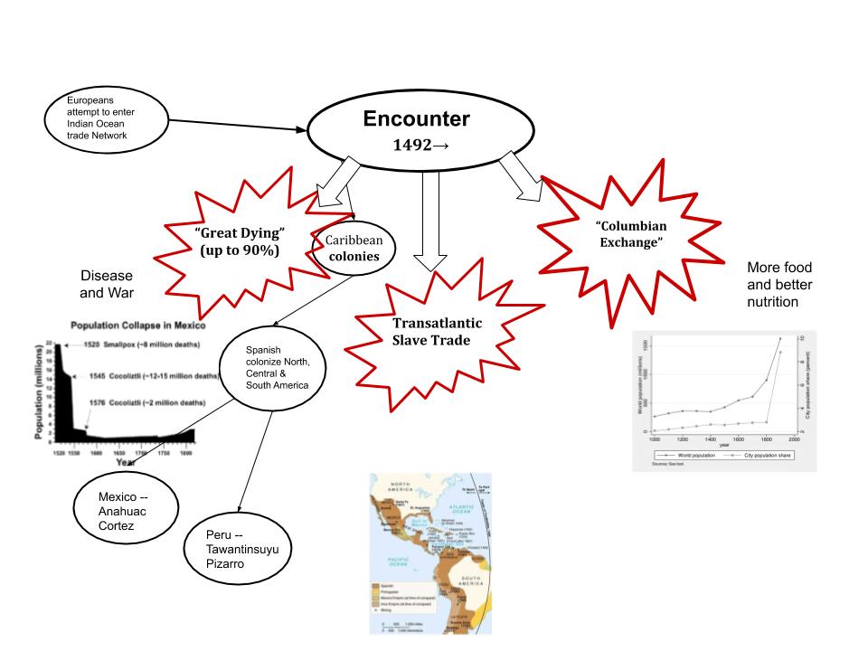 By this point, our view of the encounter has shifted completely. Columbus no longer seems so important at all. The story is now one of colonization, destruction and, for the Europeans, the beginning of a path to population growth, increasing wealth, and, eventually, political domination over large areas of the globe. The most important results of the encounter are the deaths of millions of Native Americans and the destruction of their cultures by Europeans who colonize their land, the Columbian Exchange, and the Transatlantic Slave Trade. This updated schema is represented by the diagram below.