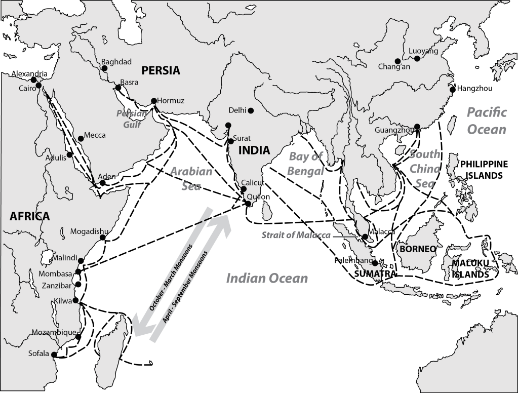 By the end of the 15th century, Europeans, mainly the Portuguese who were the first to sail around the southern tip of Africa, had finally been able to enter the vast and lucrative Indian Ocean Trade Network. For centuries, primarily-Muslim merchants had dominated the trade in this region that stretched from the eastern coast of Africa to China with India as its central fulcrum. Crucial to this trade were the spices produced in the islands to the south of mainland South East Asia, known as the East Indies. This trade would later fall into the hands of the Dutch, but at the turn of the 16th century the Portuguese were in charge, and to such an extent that the Spanish crown took the risk of sending Columbus westward in search of a route to the Indies that didn’t involve sailing all the way around Africa. It was the wealth of these “spice islands” that Columbus was hoping to find when he set sail, and his prior knowledge of them likely explains his initial confused confidence that the Caribbean Islands – the West Indies – were the East Indies that he was looking for.[2]